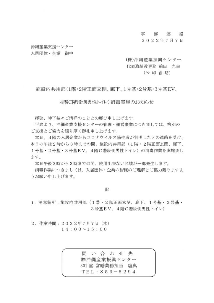 沖縄産業支援センター施設内共用部消毒実施のお知らせ